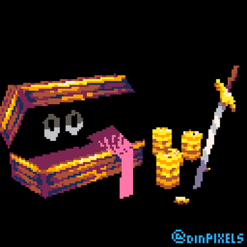 A lowpoly model of a mimic chest, sword, and coins made with picoCAD.